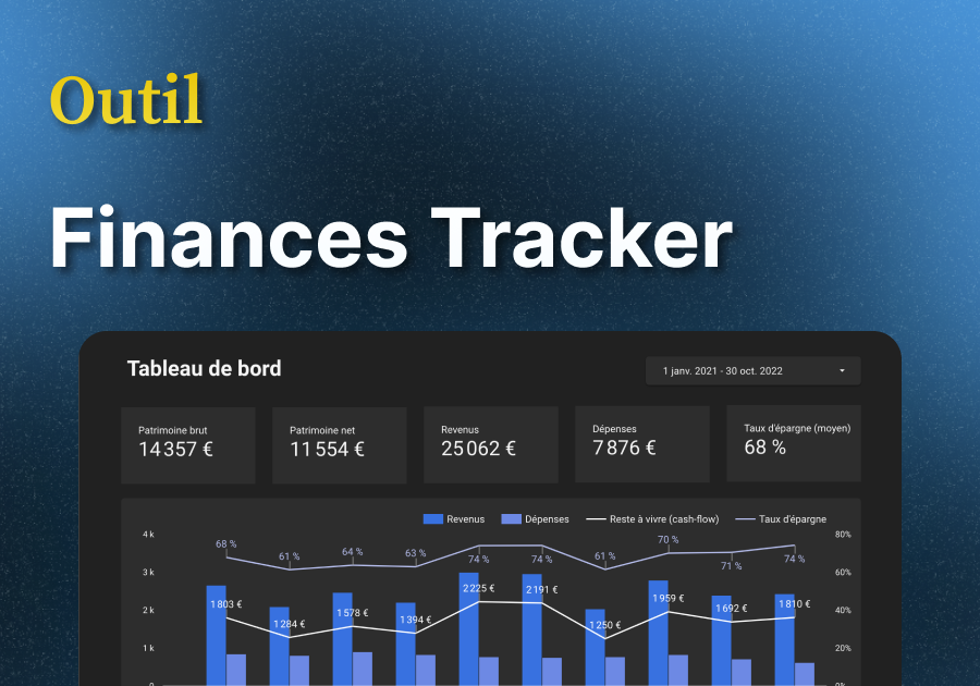 Suivez vos comptes, revenus, dépenses et investissements d'un coup d'oeil. Il vous suffit de remplir 1 seule fois par mois votre Google Sheets et d'avoir toutes vos données dans un magnifique tableau de bord.